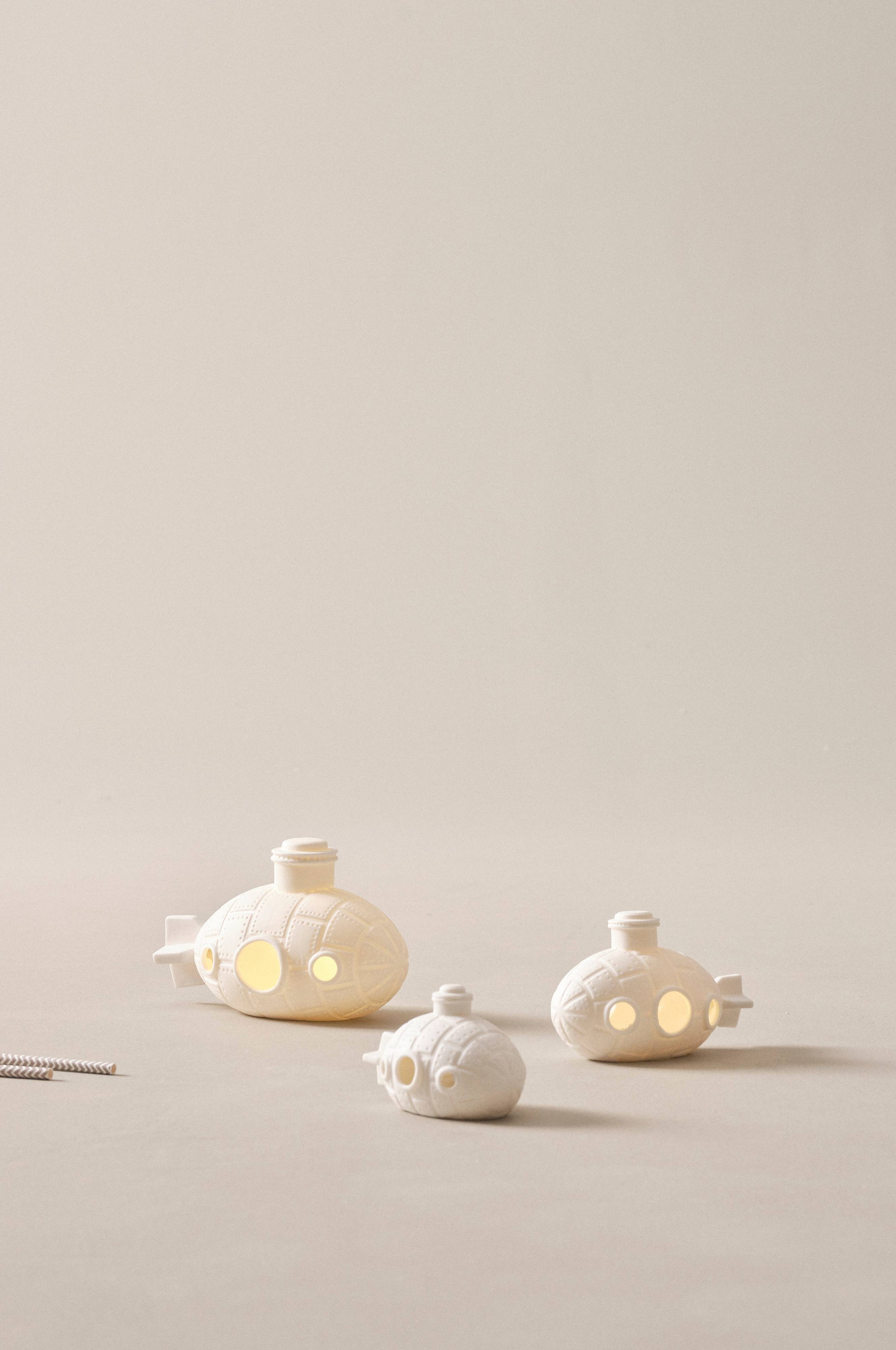 Een set van drie nachtlampjes van porselein met ledlicht. De drie lampen hebben de vorm van een kleine duikboot en zijn licht doorschijnend, zodat ze zacht, sfeervol licht verspreiden. Ze zijn ideaal als verlichting in de nacht, als zacht ledlicht of voor kinderen die zich prettiger voelen als de kamer verlicht is. Werkt op batterijen. Kleine aan-uitknop onder de lamp.