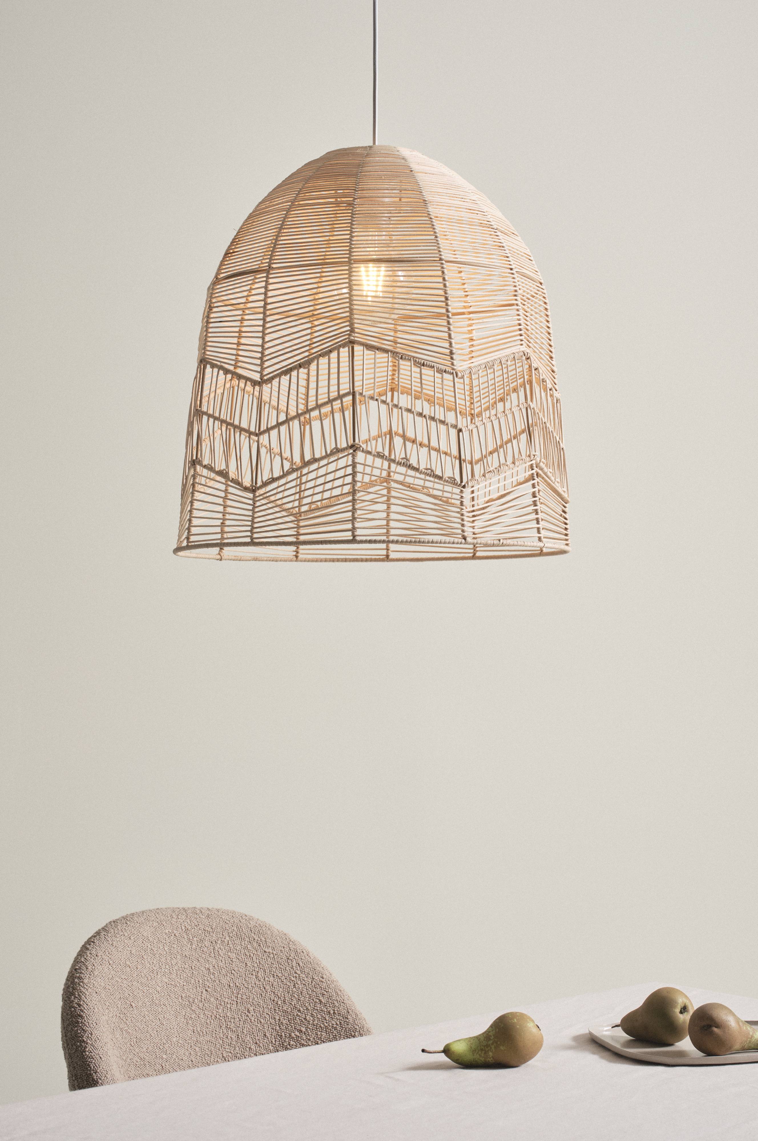 Een hanglamp van naturel rotan met een effectvol ingevlochten dessin en een frame van wit metaal. Deze sfeervolle lamp geeft met zijn natuurlijke look aangenaam licht. Het licht valt prachtig door de rotan. Rotan zorgt voor een rustieke, bohemian uitstraling. Wit snoer. De lamp is ongeaard, klasse 2. Op grond van EU-regelgeving is er in sommige landen een losse plafondstekker nodig. De plafondstekker moet ongeaard zijn (klasse 2) en wordt los verkocht.