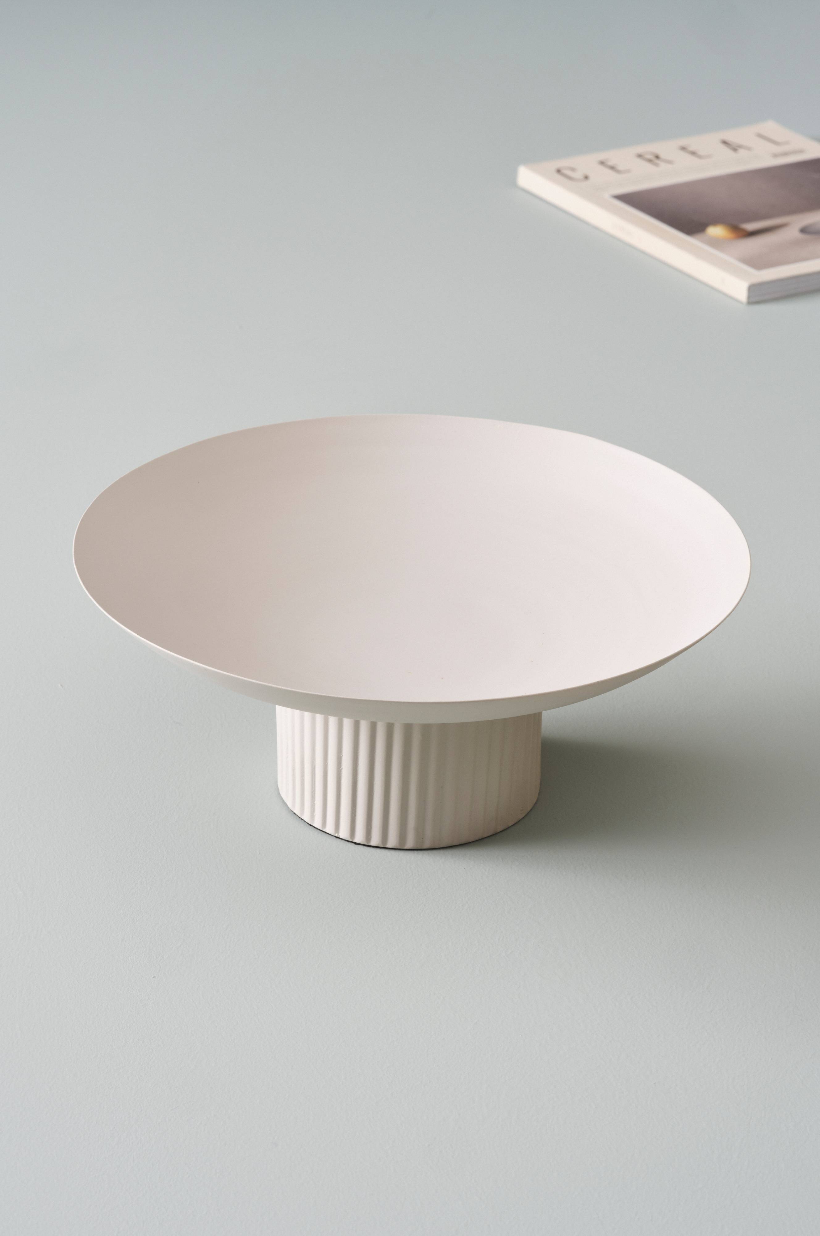 Een schaal van ijzer met een poedercoating. TOA is een platte, ronde schaal op een geribbelde voet in een luchtige, stijlvolle en ingetogen stijl die doet denken aan Japan, het land waar tafeldekken een kunst op zich is.