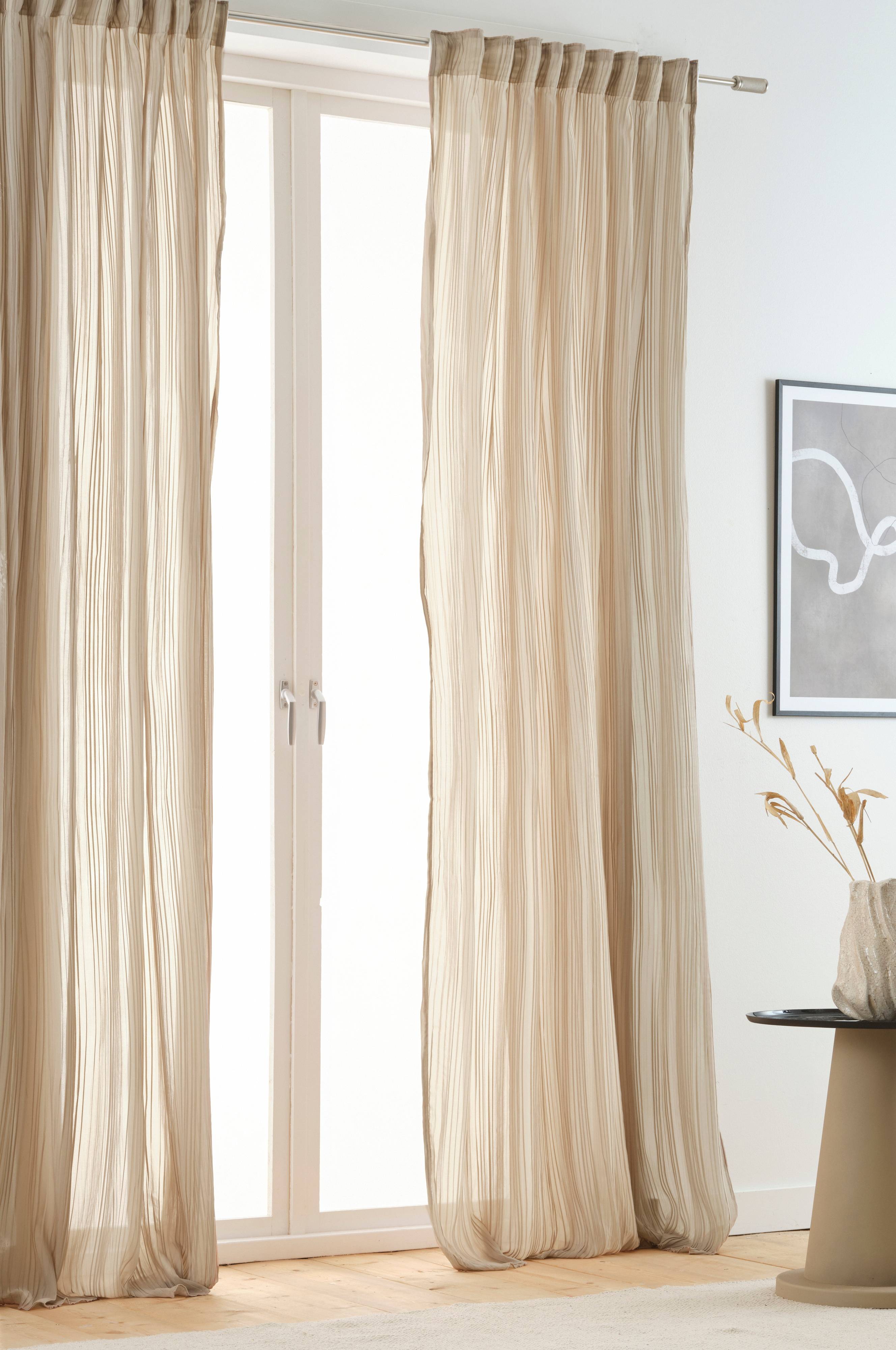 Twee plisségordijnen van polyester met vastgestikt multifunctioneel gordijnband. De transparante stof heeft kleine plooien die de gordijnen een bijzondere uitstraling geven. De onderzijde heeft een overlockzoom zodat het plissé een mooie afwerking krijgt en de plooi mooi valt. Het gordijn kan met vingerhaken, roedetunnel of blinde lussen worden opgehangen.
