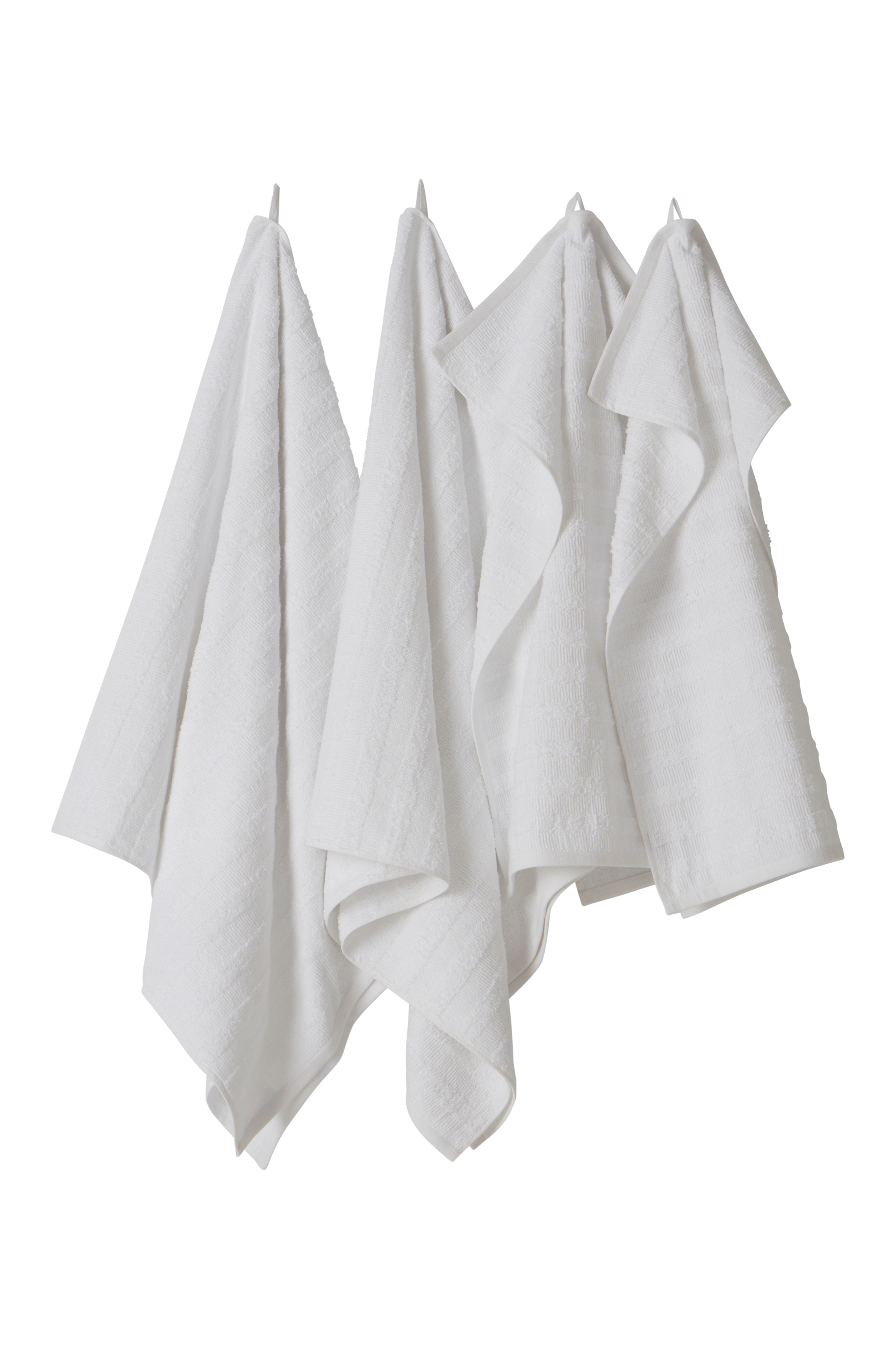 Een 4-delige badstof set bestaande uit twee handdoeken en twee badhanddoeken. De set is gemaakt van zachte, effen katoenen badstof met ingeweven structuurstrepen. De badstof heeft een aangenaam gramsgewicht (450 g/m²).