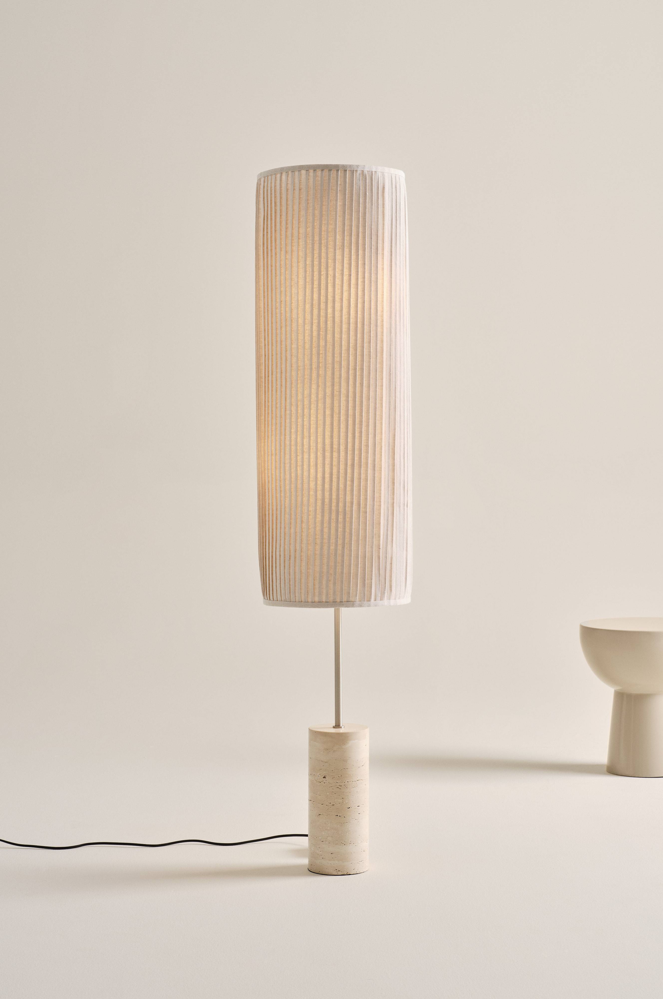 De vloerlamp TINE combineert moderne elegantie met natuurlijke natuurlijke natuurlijke materialen. De basis is van travertijn en het geplooide oversized katoenen scherm zorgt voor een verfijnde esthetiek die perfect in elke kamer past. Zwart PVC snoer met inline voet dimmer schakelaar maakt het mogelijk om de verlichting aan te passen. De discrete charme van tanden maakt het een veelzijdige toevoeging aan moderne interieurs.