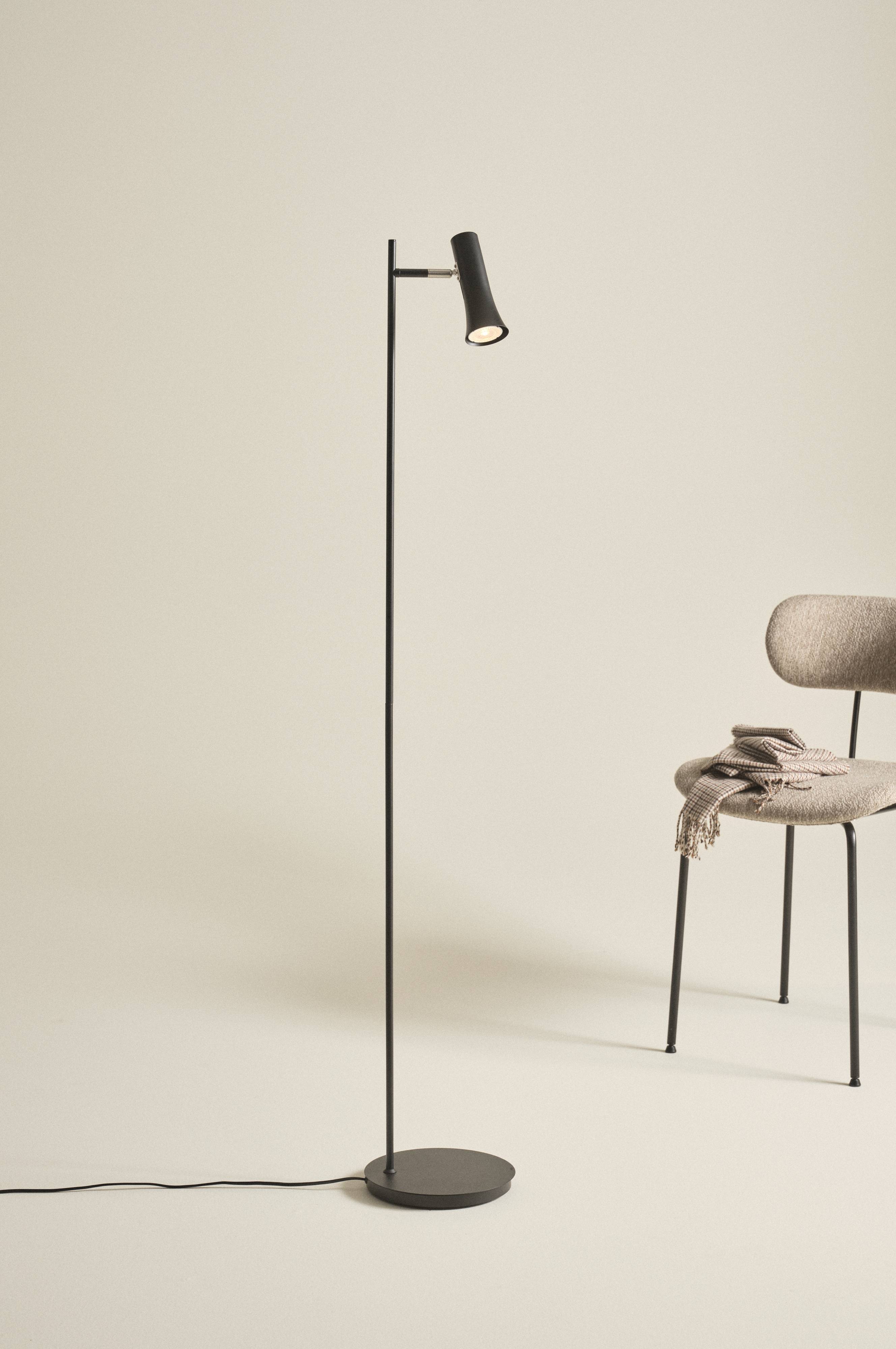 Een staande lamp van metaal met een kleine en handige lampenkap met goed leeslicht De lamp is stijlvol en gemakkelijk te plaatsen, perfect bij de leesstoel. Transparant snoer.
