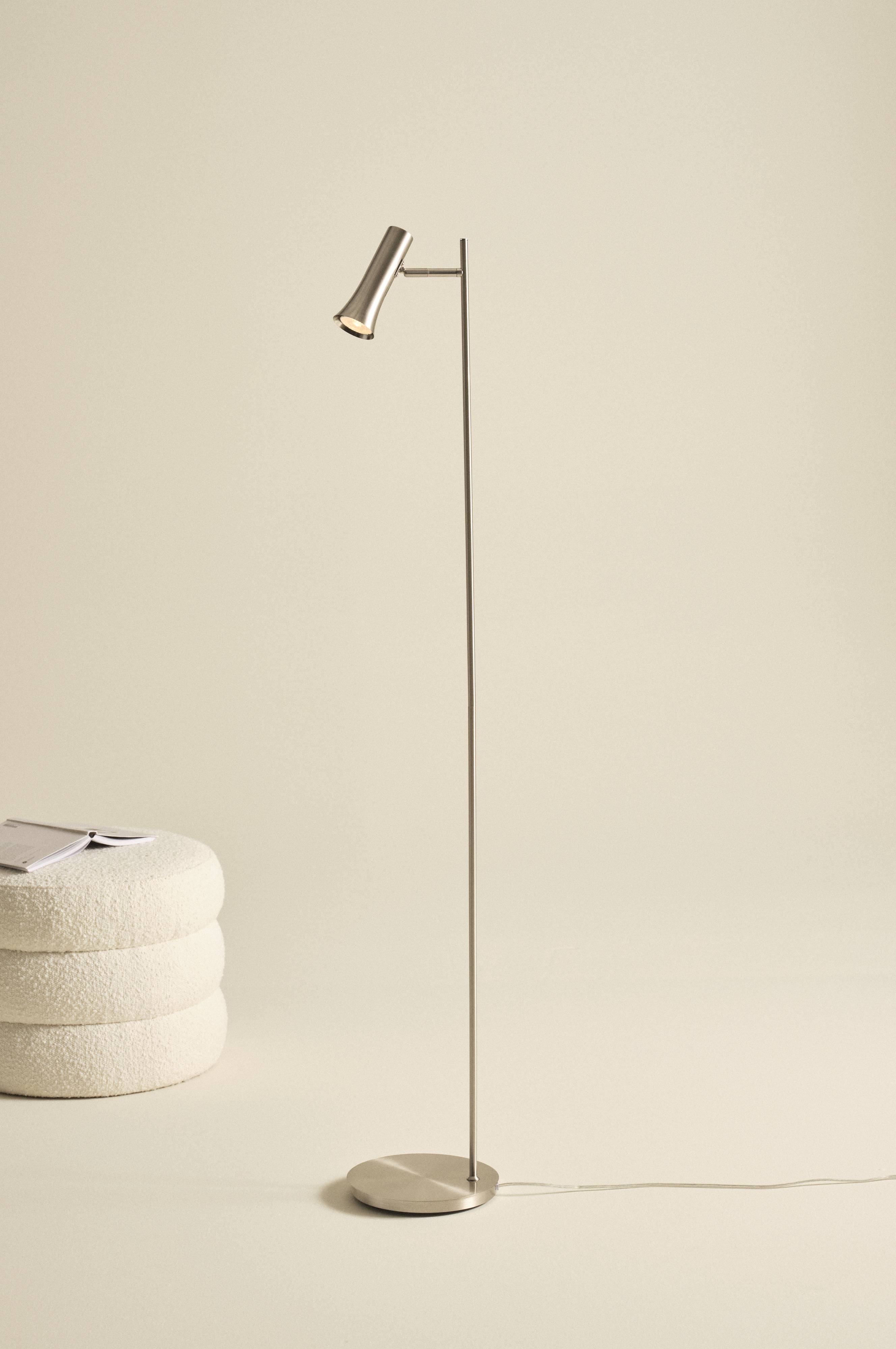 Een staande lamp van metaal met een kleine en handige lampenkap met goed leeslicht De lamp is stijlvol en gemakkelijk te plaatsen, perfect bij de leesstoel. Transparant snoer.