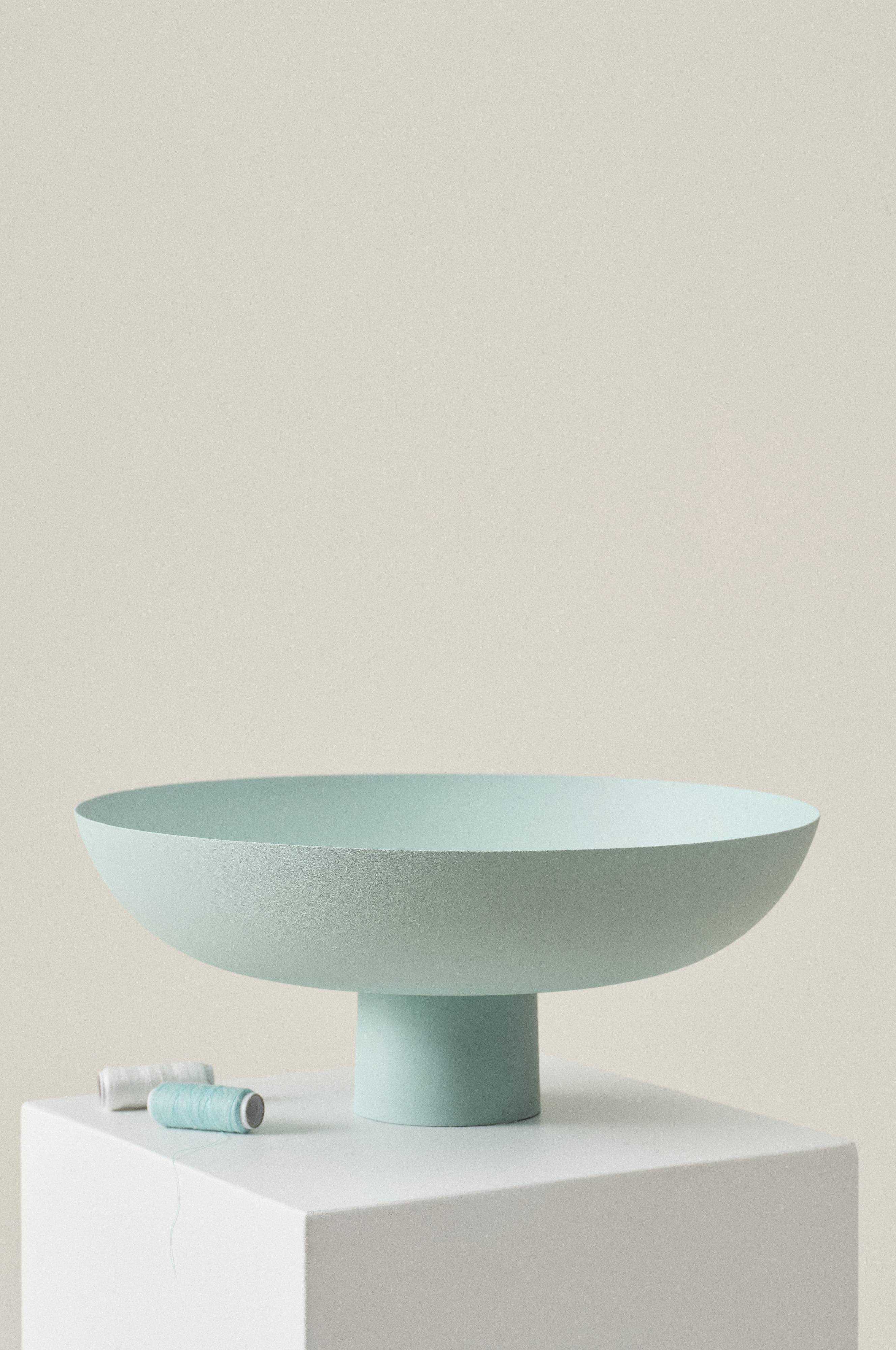 Een grote schaal/bloempot van metaal op een voet. Zet hem gewoon zo neer als decoratief object of je laat je fantasie de vrije loop en voorzie de schaal van prachtige schelpen en stenen, een lichtsnoer of mooie planten. De schaal is afgewerkt met een matte lak.