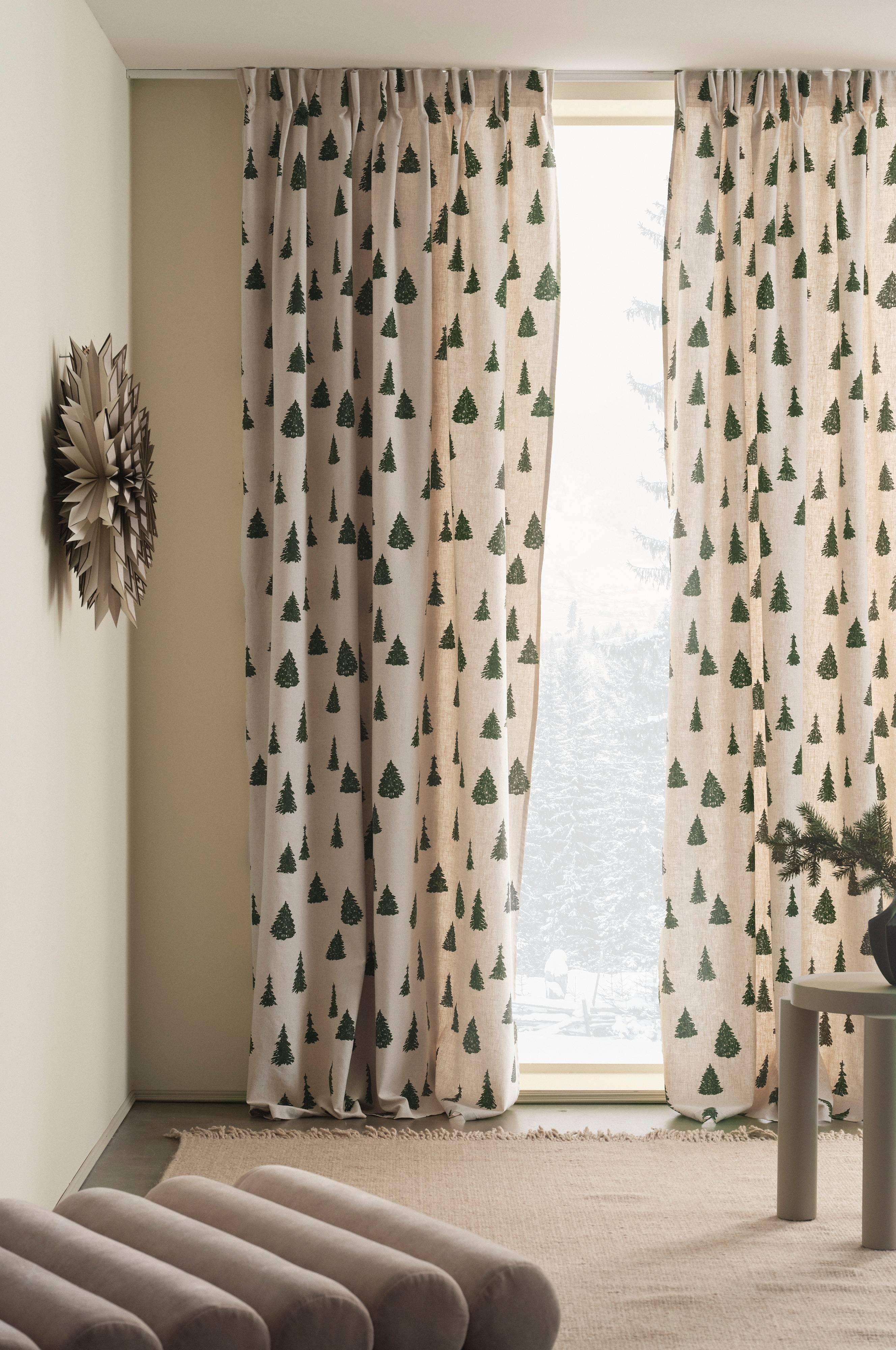Een set van twee gordijnen in de serie TREES, een mooie kwaliteit van katoen en linnen met een wassing die de stof extra zacht maakt. Door de geschetste dennenbomen op een ongeverfde ondergrond ontstaat een natuurlijke look en TREES is een serie die je het hele jaar door kunt gebruiken, maar die ook voor een rustige en harmonieuze kerstsfeer zorgt. De gordijnen hebben een vastgestikt multifunctioneel gordijnband en kunnen met vingerhaken, roedetunnel of blinde lussen worden opgehangen. Gewicht stof 210 gr./m².
