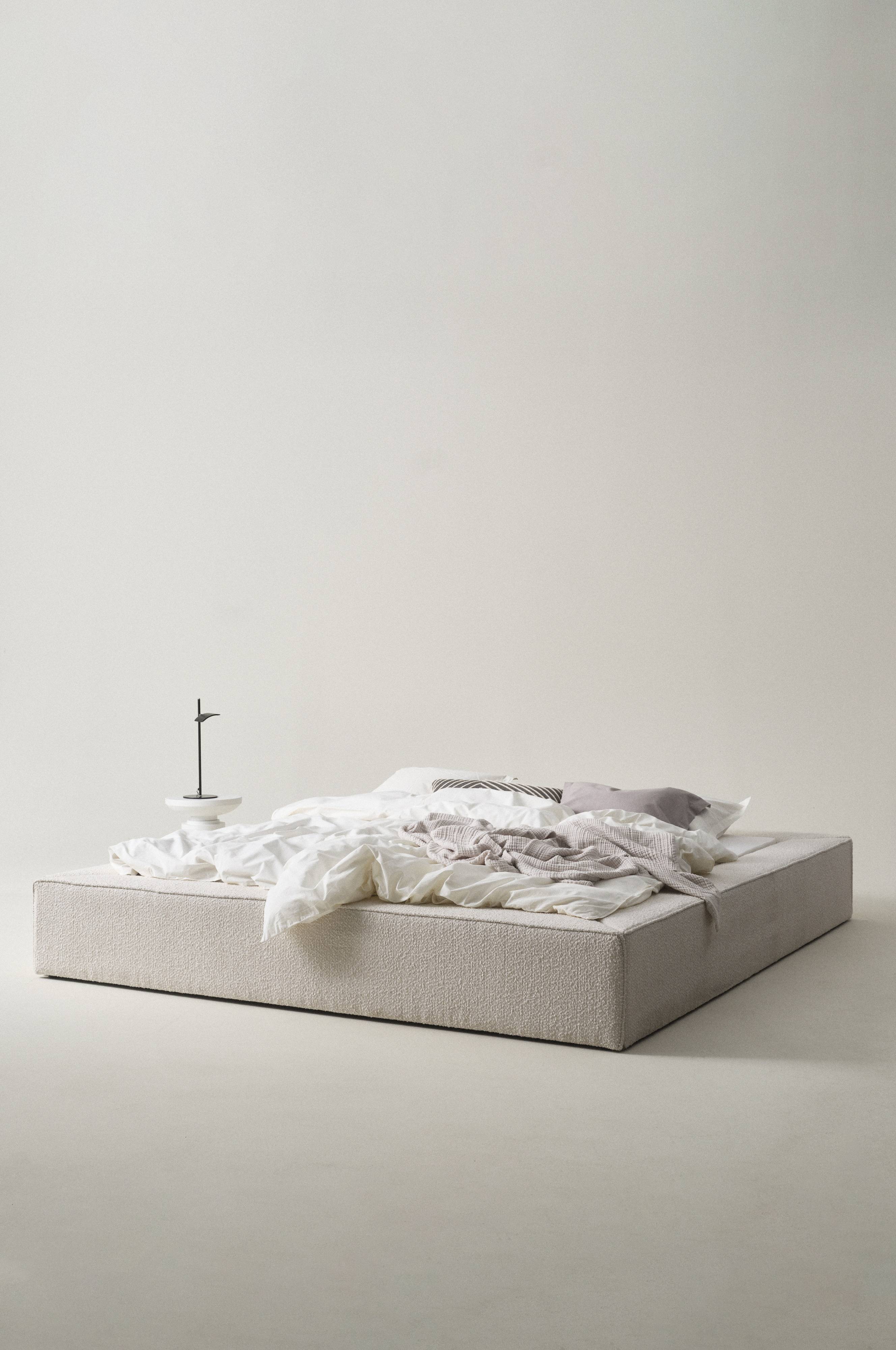 Het bedframe heeft een eenvoudig en innovatief model en is gemaakt van FSC-gecertificeerd grenen en multiplex. Het bed lijkt bijna te zweven in de slaapkamer en je kunt comfortabel op de rand zitten. Het frame bestaat uit een brede houten rand rondom die is bekleed met een zachte boucléstof met een zachte vulling. De stof heeft een slijtvastheid van 40.000 Martindale. Het bedframe heeft een lattenbodem van multiplex. Maak het bed compleet met matrassen of boxsprings, afhankelijk van je voorkeur. De smalle luchtspleet onderaan in combinatie met een lattenbodem zorgt voor een uitstekend slaapklimaat en een goede luchtcirculatie. Matras/boxspring niet inbegrepen. Enige montage is vereist. Montage-instructies worden meegeleverd.