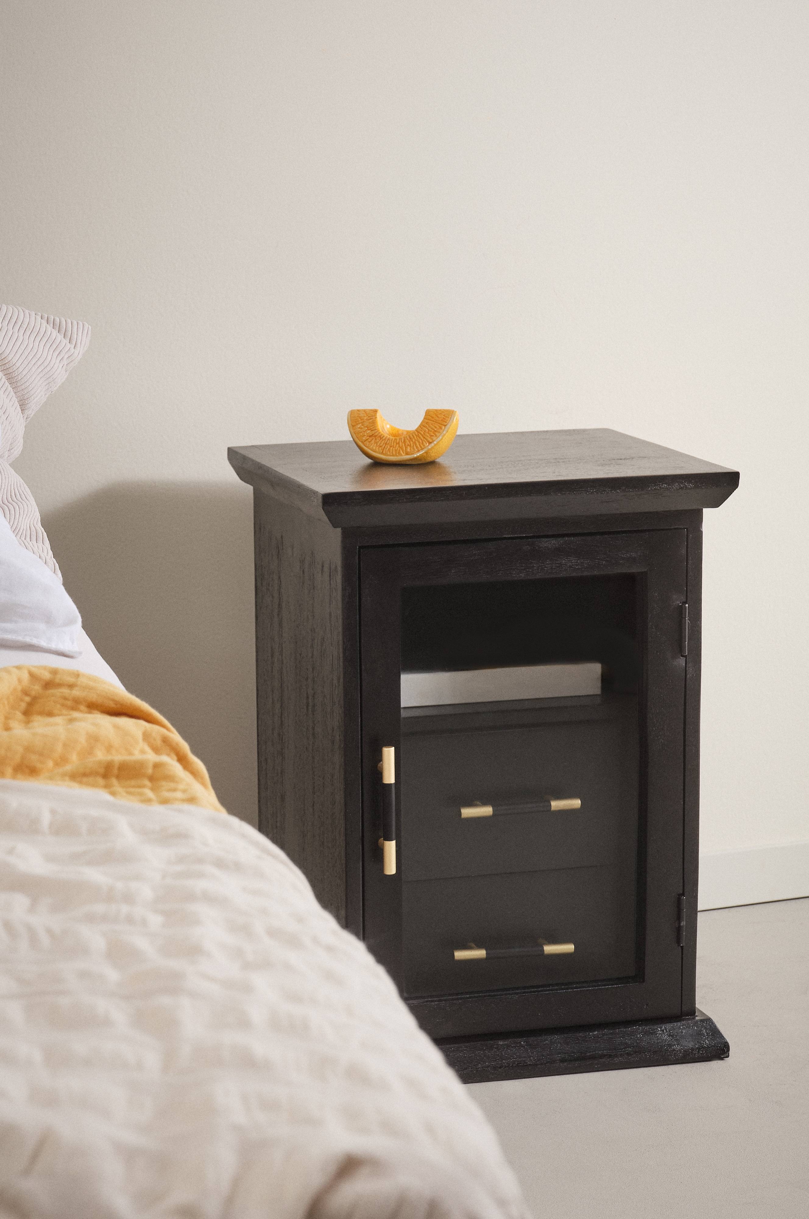 TRUNK is een nachtkastje van mangohout en mdf met een glazen deurtje. Het nachtkastje heeft een kroonlijst boven en onder en aan de binnenkant bevindt zich een inzet met twee lades. De inzet is vast, de ruimte erboven kan worden gebruikt als plank. De deur en de lades worden geopend met een handgreep van tweekleurig metaal. De deur heeft een magneetsluiting. Het nachtkastje is praktisch ingericht, zodat je over een mooie opbergruimte naast je bed beschikt.