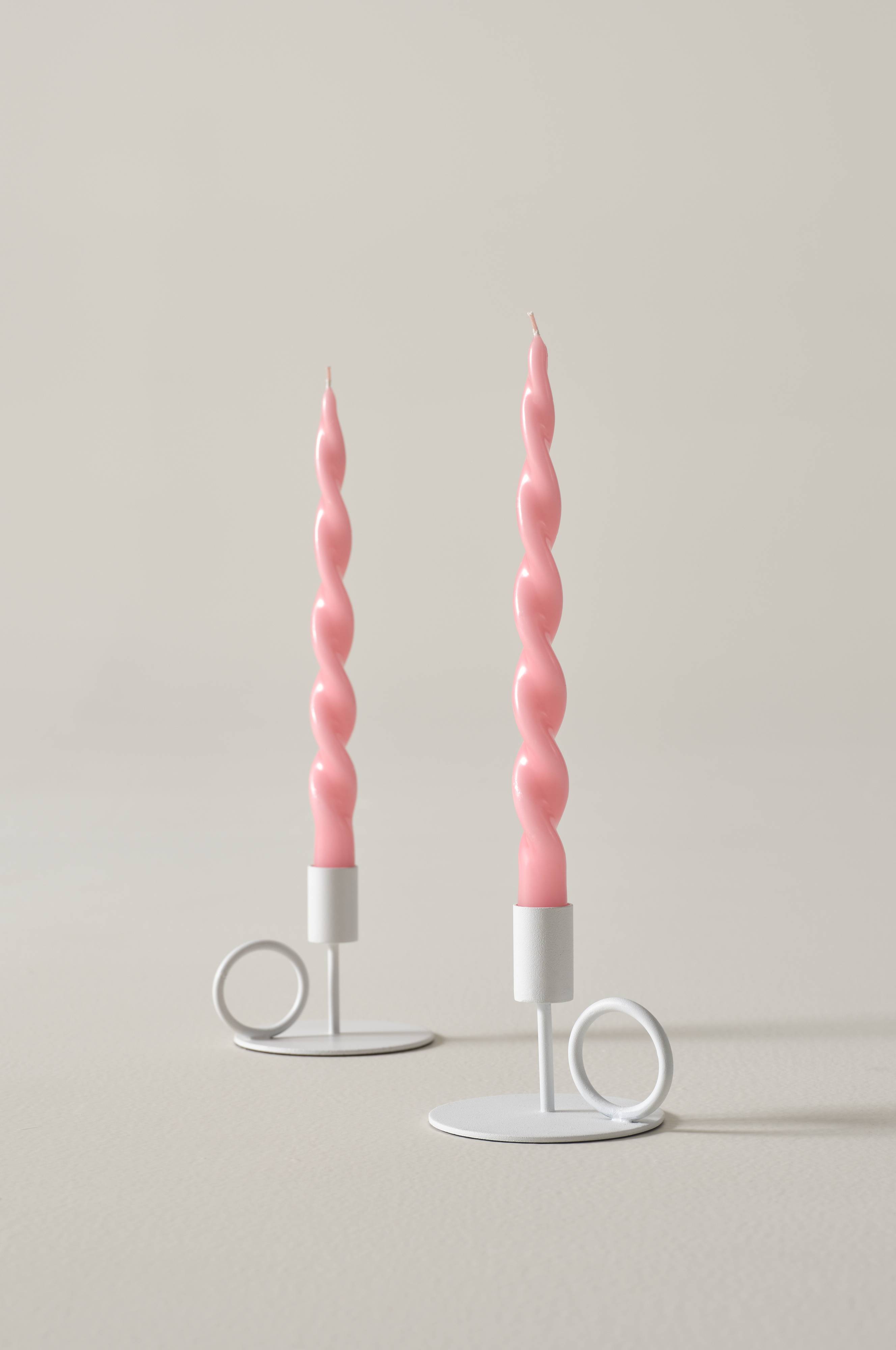 Een set van twee kaarsen van stearine en paraffine die vervolgens in een kleur zijn gedoopt en afgelakt zijn. De kaarsen hebben een mooie, handgedraaide schroefvorm. Ze zijn ook als ze niet branden zeer decoratief. Kaarsen brengen een gezellige sfeer in huis. De stearine bevat geen palmolie.