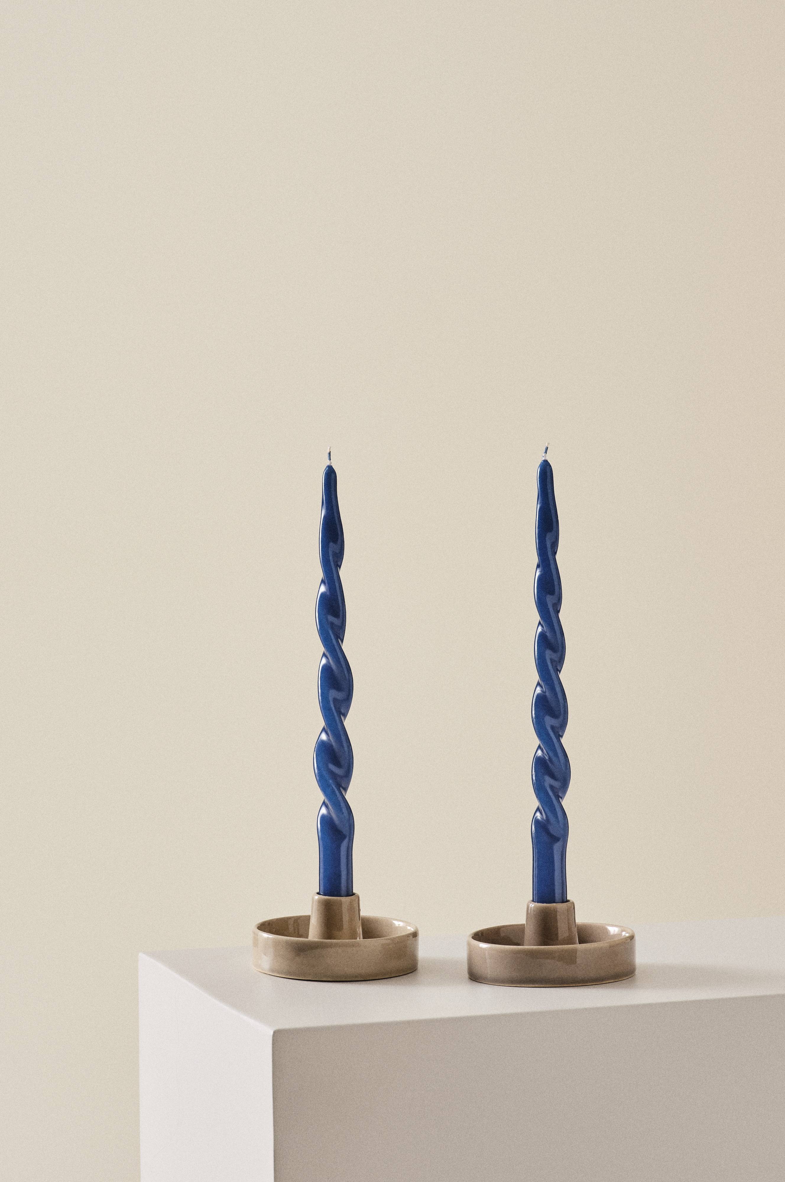 Een set van twee kaarsen van stearine en paraffine die vervolgens in een kleur zijn gedoopt en afgelakt zijn. De kaarsen hebben een mooie, handgedraaide schroefvorm. Ze zijn ook als ze niet branden zeer decoratief. Kaarsen brengen een gezellige sfeer in huis. De stearine bevat geen palmolie.