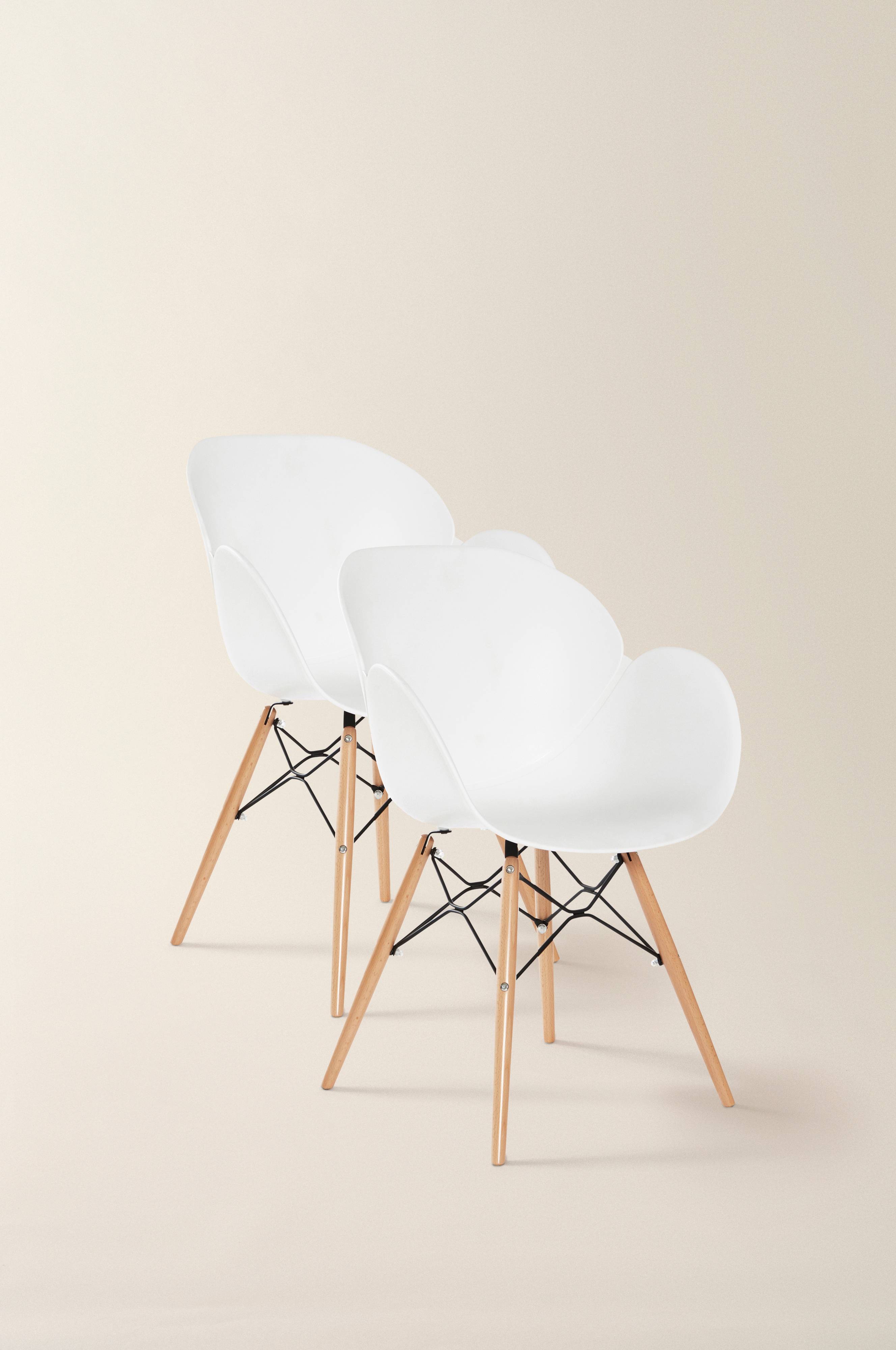 Een set van twee stoelen met een vormgegoten zitting van polypropyleen, beukenhouten poten en een metalen frame. Een moderne stoel met ronde vormen, armleuningen en goed zitcomfort. De stoel heeft een slanke uitstraling en is geschikt als eetkamerstoel, maar ook als losse stoel in de hal. Enige montage is vereist. Montage-instructies worden meegeleverd.