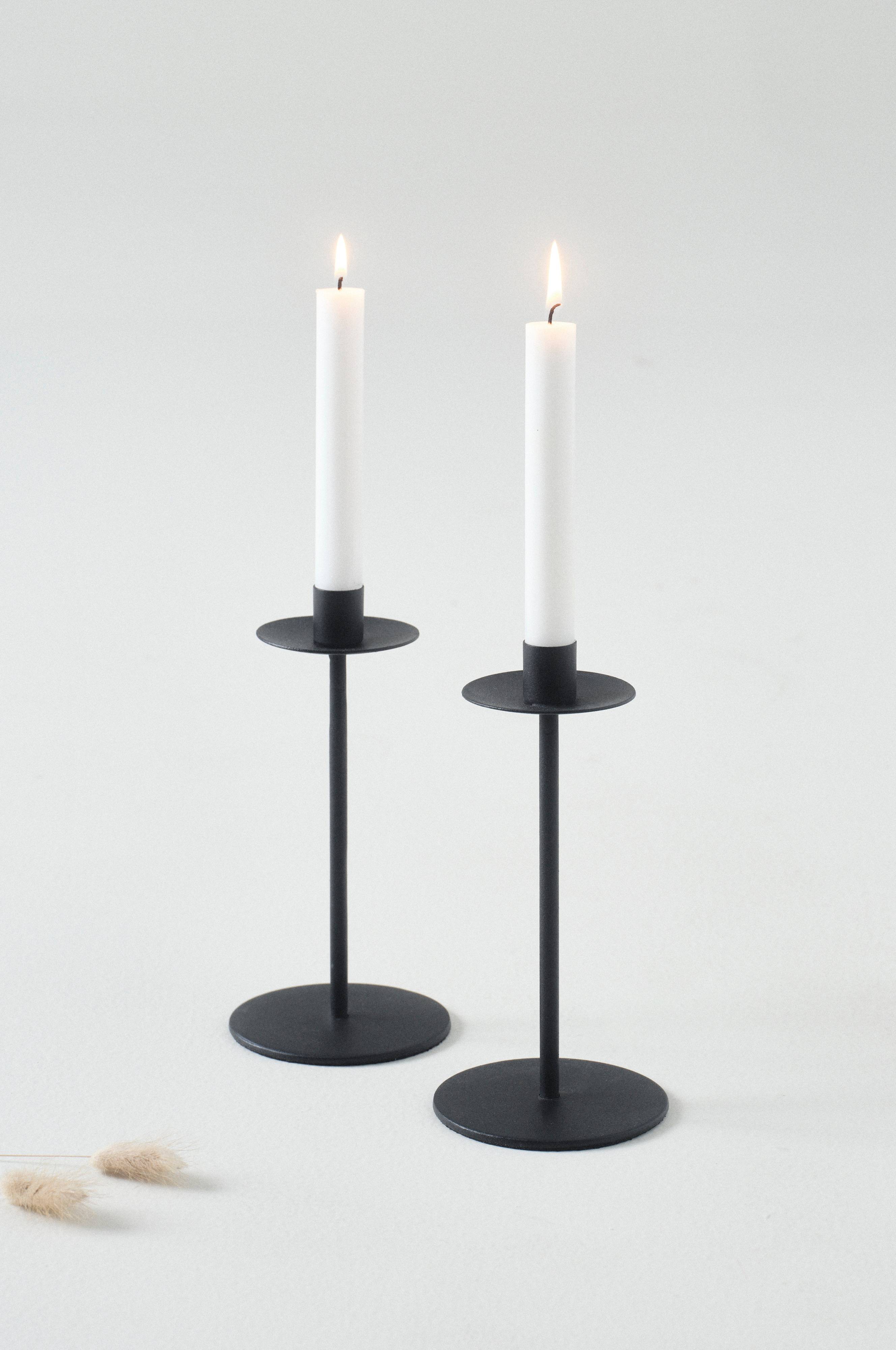 Een set van twee kandelaars van ijzer. De stijlvolle, slanke kandelaars hebben een matzwarte poedercoating of een geborstelde, zilverkleurige afwerking. Een kaars is niet inbegrepen.