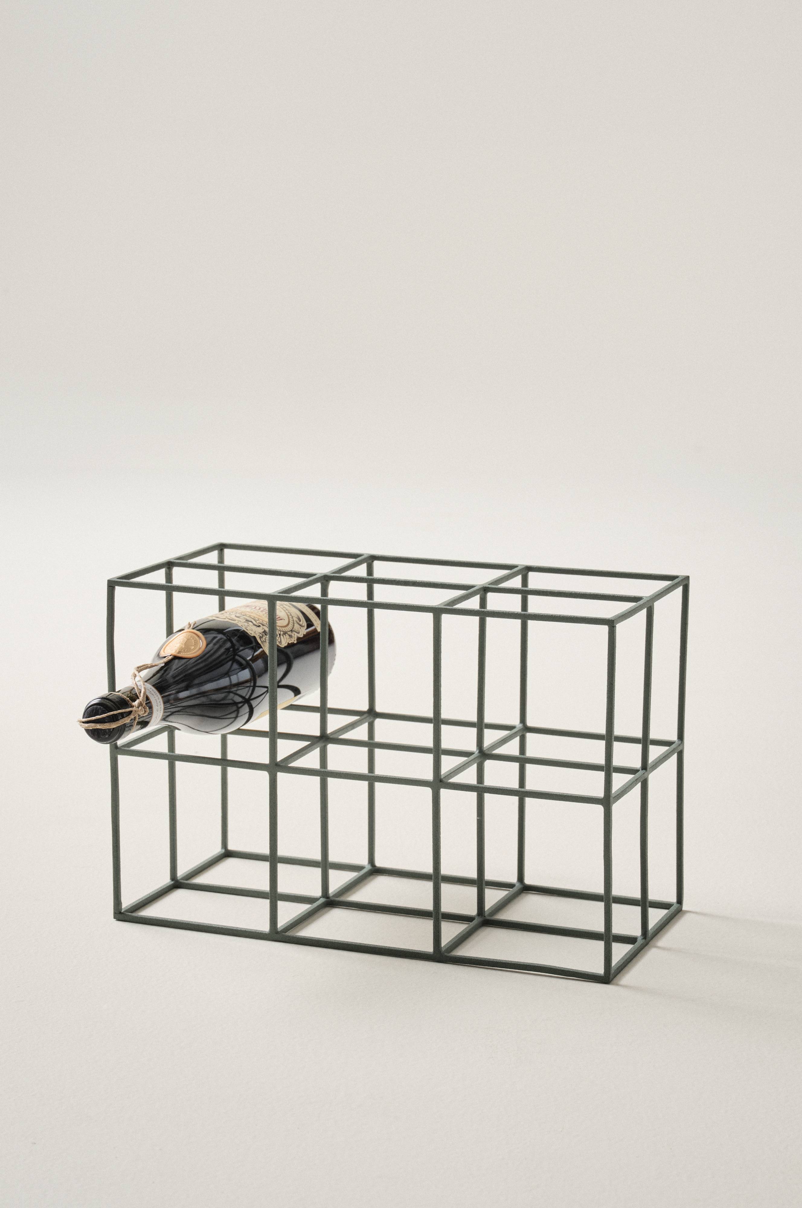 Wijnrek voor zes flessen. Gemaakt van een matzwart, hoekig metaalprofiel voor een strak design dat overal past. Je kunt kiezen of je het liggend of staand wilt plaatsen.