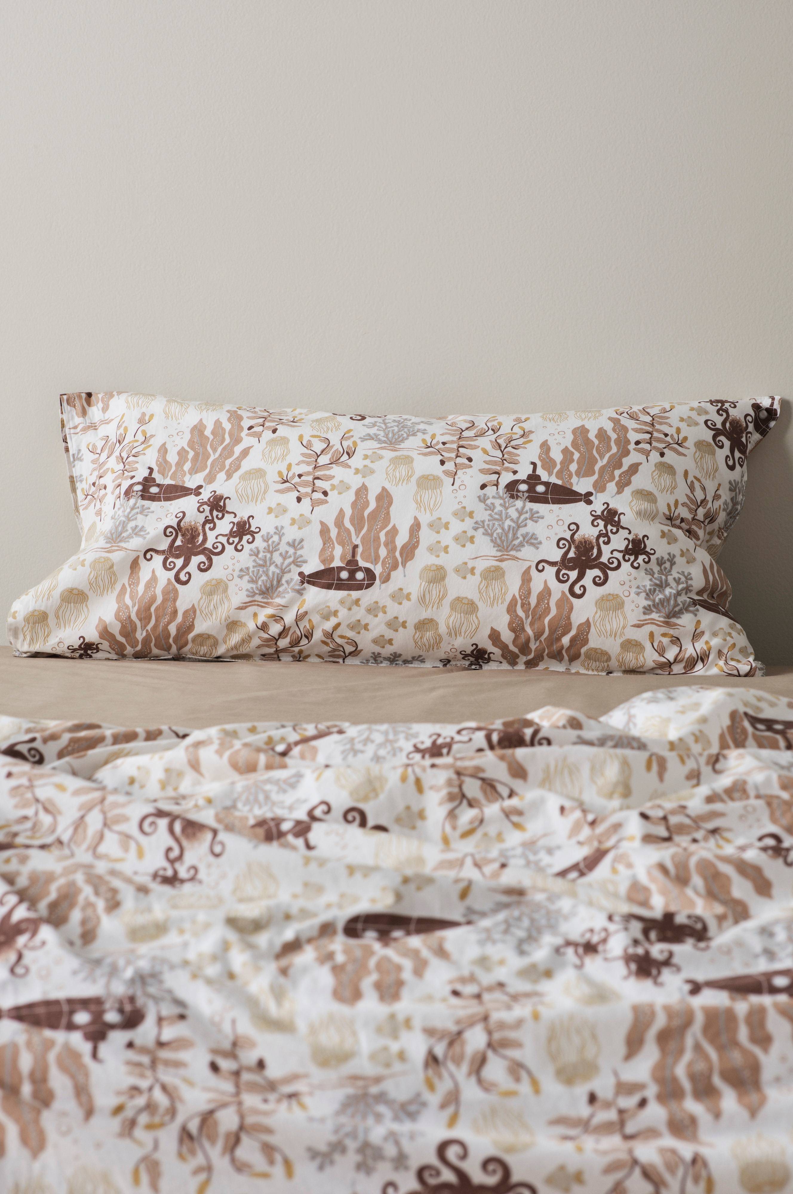 Een kussensloop van heerlijk biologisch katoenen perkal met een geprint dessin dat ontworpen is door Maria Carlberg. Dit prachtige dessin is geïnspireerd op sprookjesachtig onderwaterleven in rustige en harmonieuze kleuren. WATERS is een gezellige collectie die ruimte biedt voor fantasie. Perkal is een extra zachte, aangename kwaliteit gemaakt van geweven, dun katoenen garen. Draaddichtheid 200. (De draaddichtheid geeft het aantal draden aan per vierkante inch van een stof. Hoe hoger de draaddichtheid, hoe hoger de kwaliteit.)