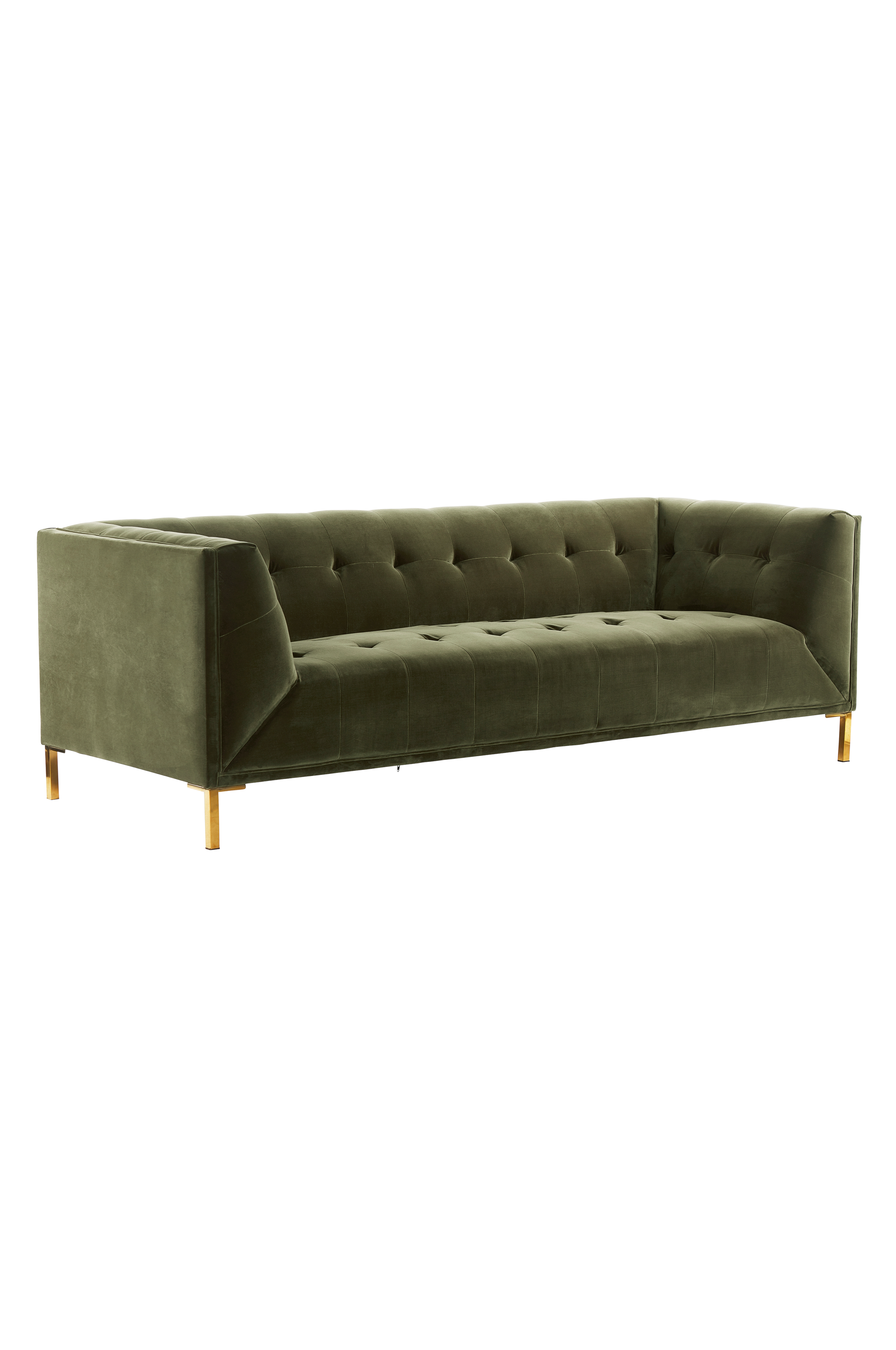 Stijlvolle fluwelen bank die net zo goed past in een modern interieur als in een huis met een retro uitstraling. De WINCHESTER bank heeft rechte goudkleurige metalen poten en diep ingesneden knopen voor een exclusieve uitstraling. De rug en zijkanten zijn volledig glad. WINCHESTER heeft een stevig frame van hout en multiplex en een uitstekend zitcomfort dankzij de fantastische koudschuimstructuur, zigzagvering, elastische banden en comfortabele polyester vulling.