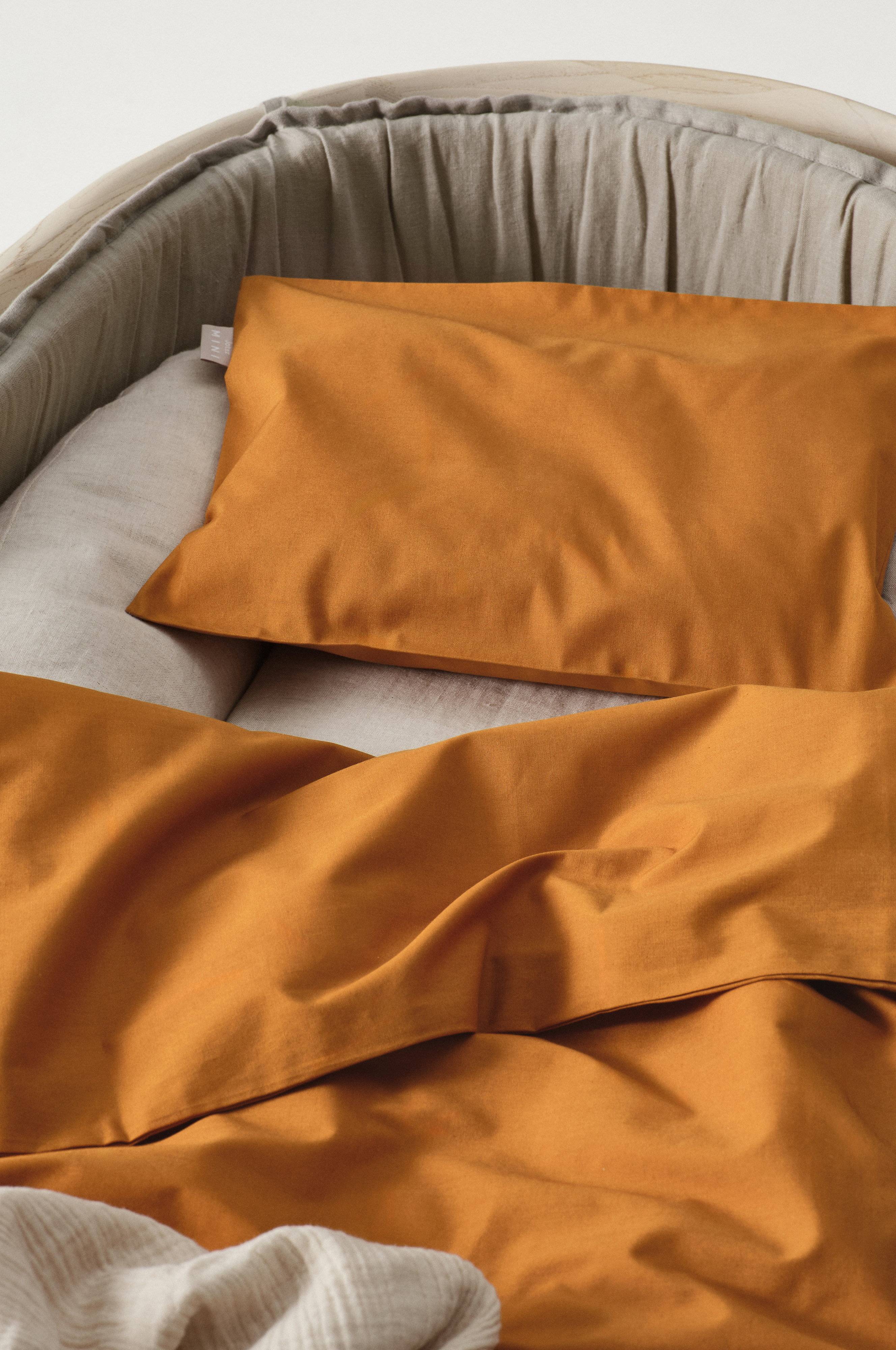 Een effen dekbedovertrekset bestaande uit een dekbedovertrek en een kussensloop van heerlijk perkal van biologisch katoen. De set is geschikt voor een wieg en een kinderwagen. Perkal is een extra zachte, aangename kwaliteit gemaakt van geweven, dun katoenen garen. Draaddichtheid 200. (De draaddichtheid geeft het aantal draden aan per vierkante inch van een stof. Hoe hoger de draaddichtheid, hoe hoger de kwaliteit.)