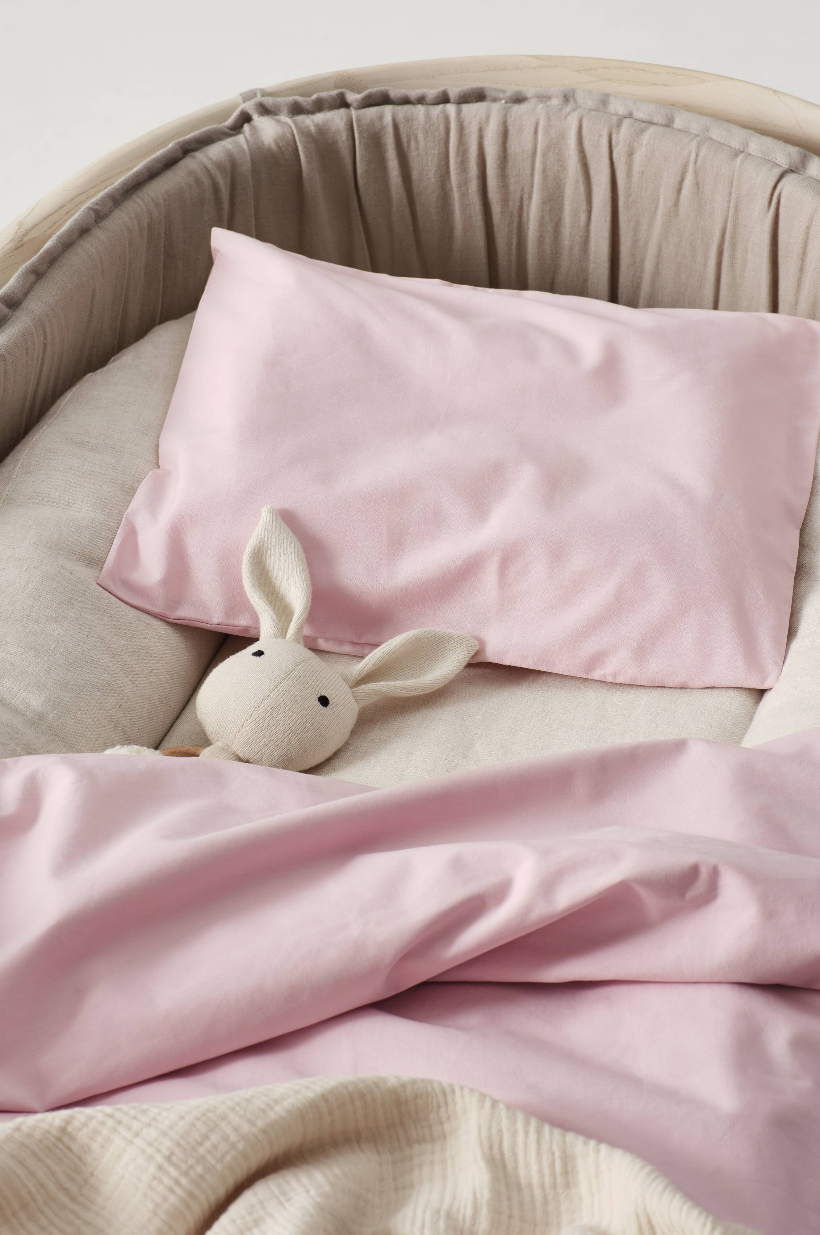 Een effen dekbedovertrekset bestaande uit een dekbedovertrek en een kussensloop van heerlijk perkal van biologisch katoen. De set is geschikt voor een wieg en een kinderwagen. Perkal is een extra zachte, aangename kwaliteit gemaakt van geweven, dun katoenen garen. Draaddichtheid 200. (De draaddichtheid geeft het aantal draden aan per vierkante inch van een stof. Hoe hoger de draaddichtheid, hoe hoger de kwaliteit.)