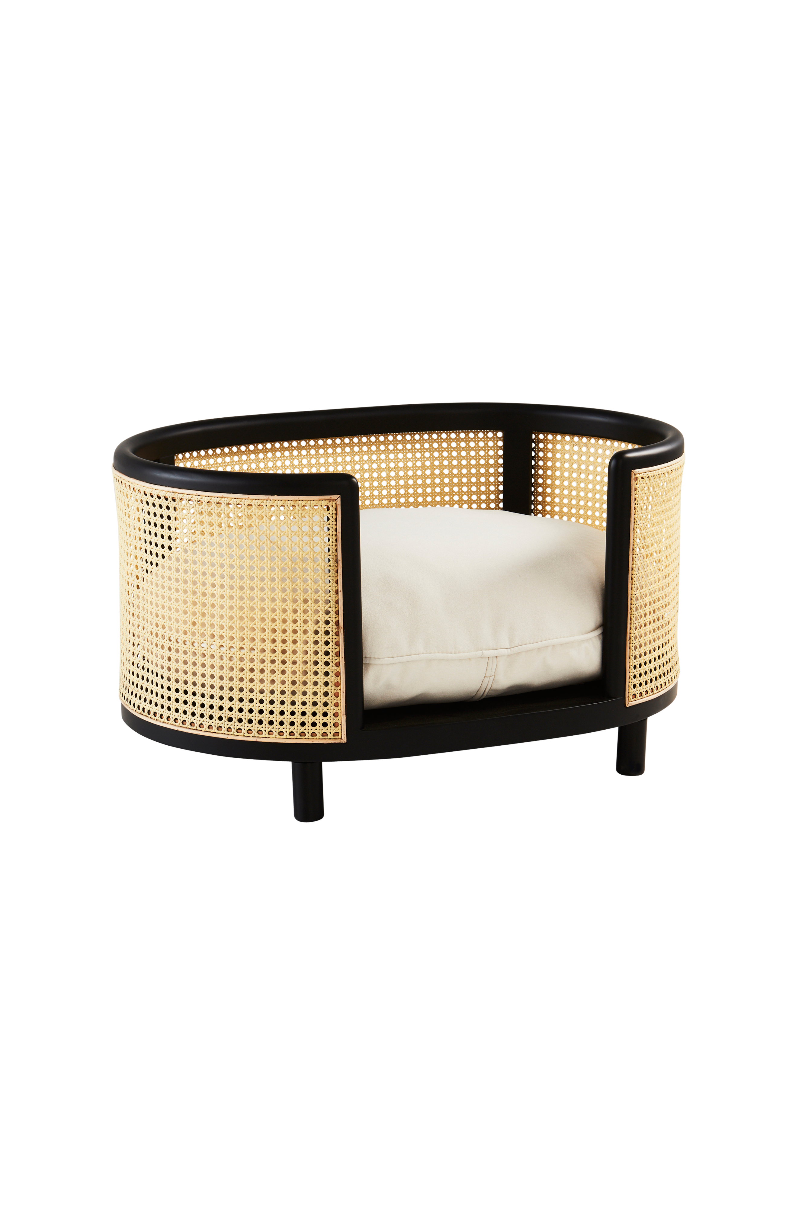 Een heerlijke hondenmand/kattenmand met een dik kussen, een frame van hout en rotan en een bodem van mdf. Een perfect bedje voor je favoriete viervoeter.