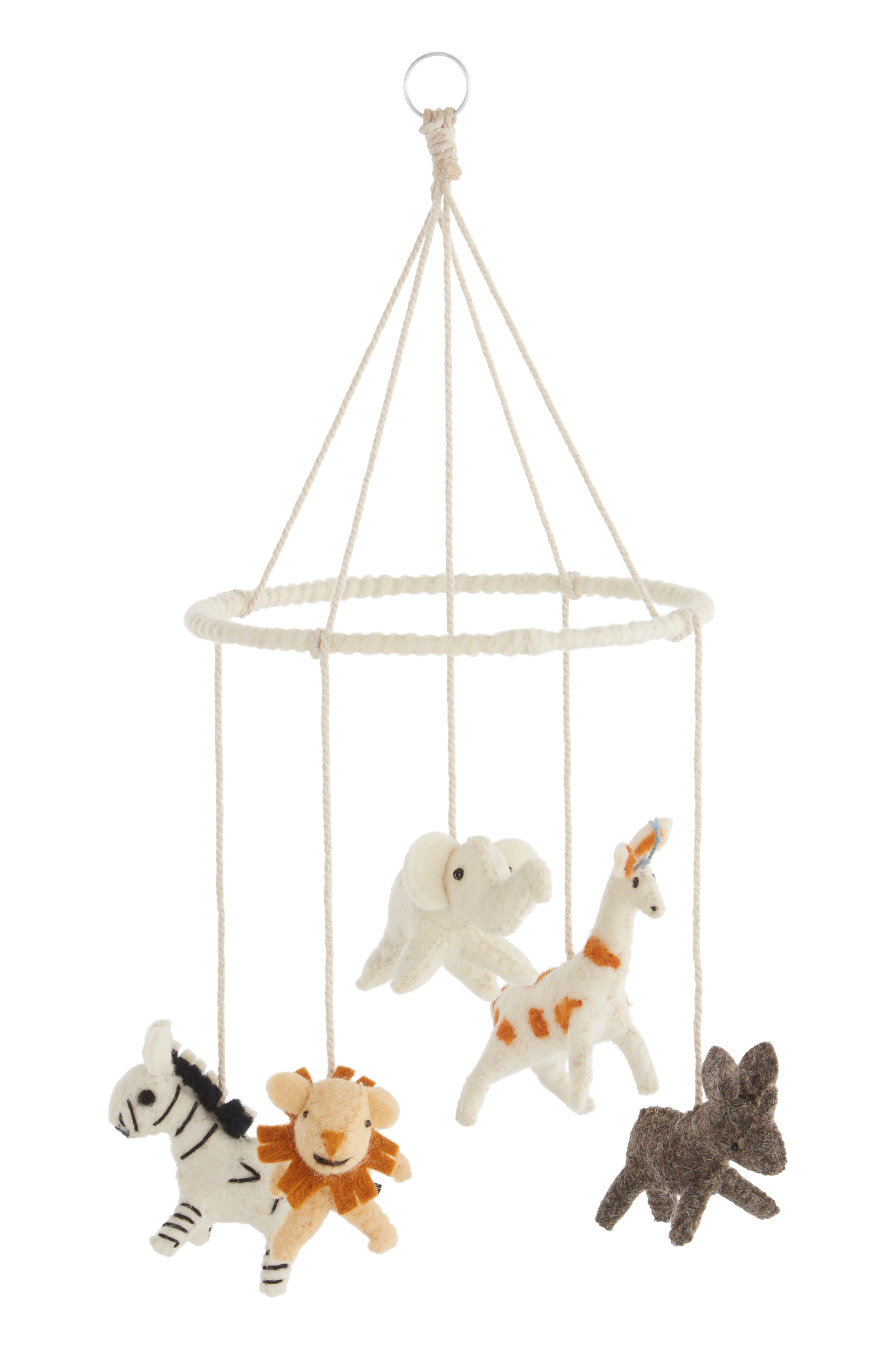 Een handgemaakte mobile met vijf schattige wilde dieren van gevilte wol. Wol is een heerlijk natuurlijk materiaal. De diertjes hebben een vulling van polyester. De dieren hangen aan katoenen draad dat bevestigd is aan een ring van bekleed staal. Het ringetje bovenaan kan aan een haakje gehangen worden of bevestig er een koordje aan om het aan het plafond te hangen. Door het mooie handwerk is elke mobile uniek.
